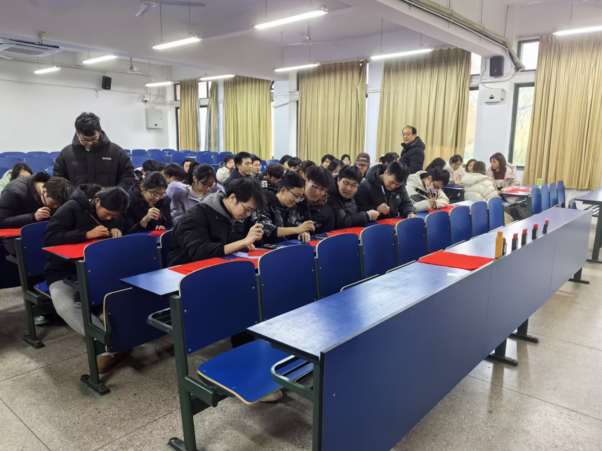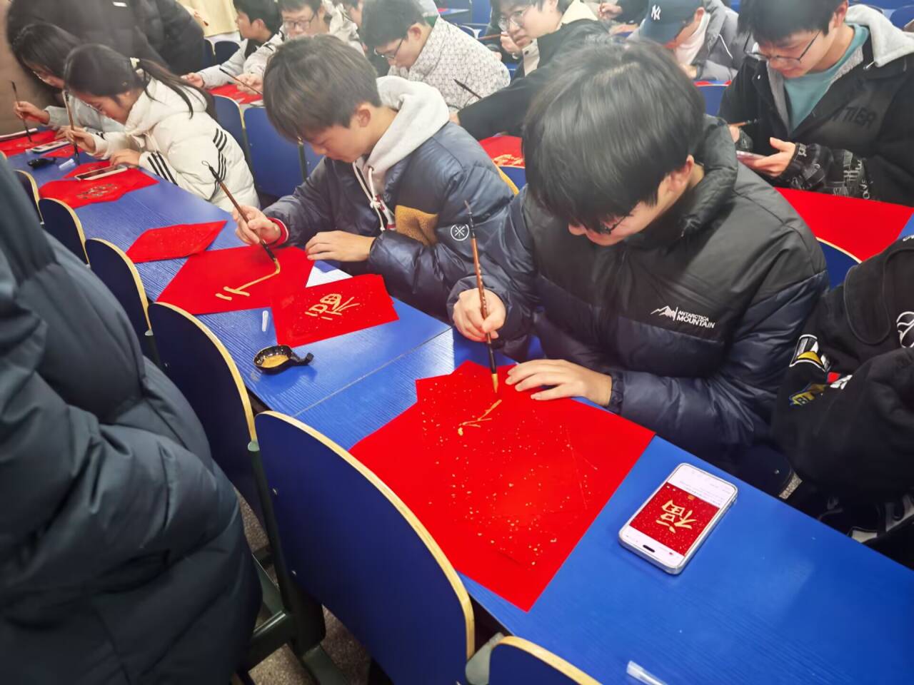 学子挥毫创作,墨香萦绕校园。同学们以寝室为单位围坐一桌,或临摹经典、或创意改编,将寝室特色、学院元素融入福字设计中。楷书工整端庄、行书飘逸流畅、隶书古朴厚重,一幅幅饱含心意的福字在笔下逐渐成型。大家相互交流书写心得,分享新年愿望,墨香与欢声笑语交织,充分感受着传统书法艺术的独特魅力与集体生活的温暖。