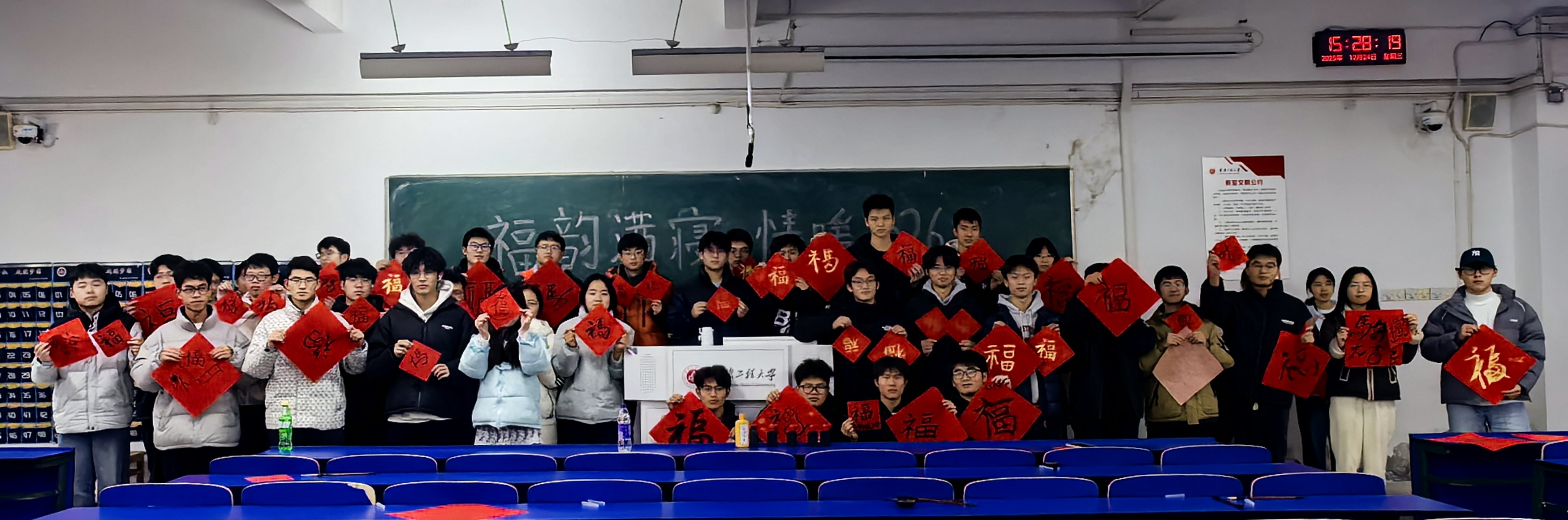 创意装饰寝室,福满家园迎新。书写环节结束后,各参赛寝室围绕“福”文化主题,结合寝室特色进行创意装饰。同学们发挥奇思妙想,将手写福字张贴于寝室门、窗户、书桌等位置,搭配色彩鲜艳的彩带与寓意吉祥的贴纸,精心布置寝室公共区域。有的寝室以“电院福运”为灵感,将福字与电路元素巧妙结合;有的寝室打造“温馨福窝”主题,用福字串联起室友间的情谊;还有的寝室融入新年生肖元素,让寝室充满浓浓的年味。