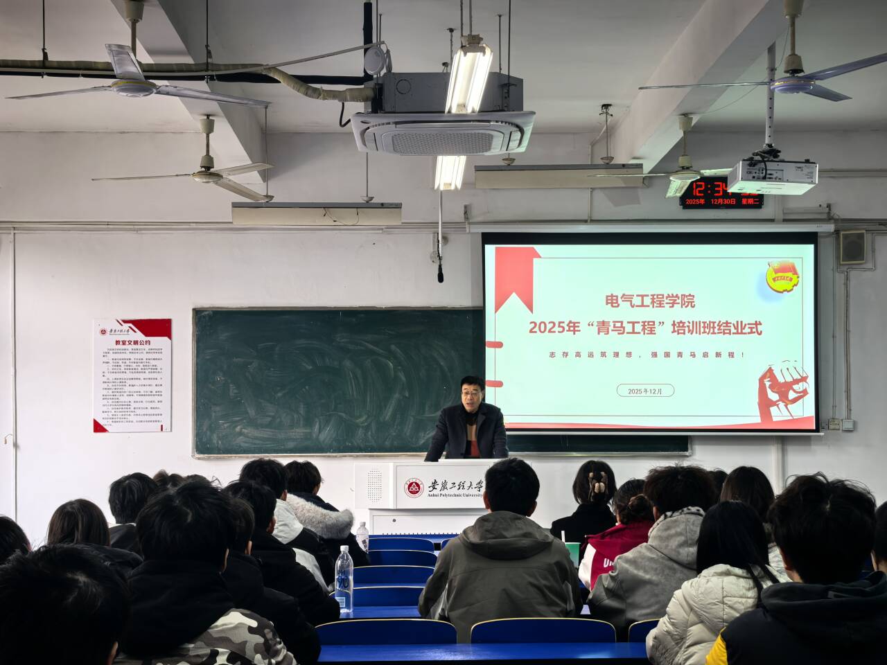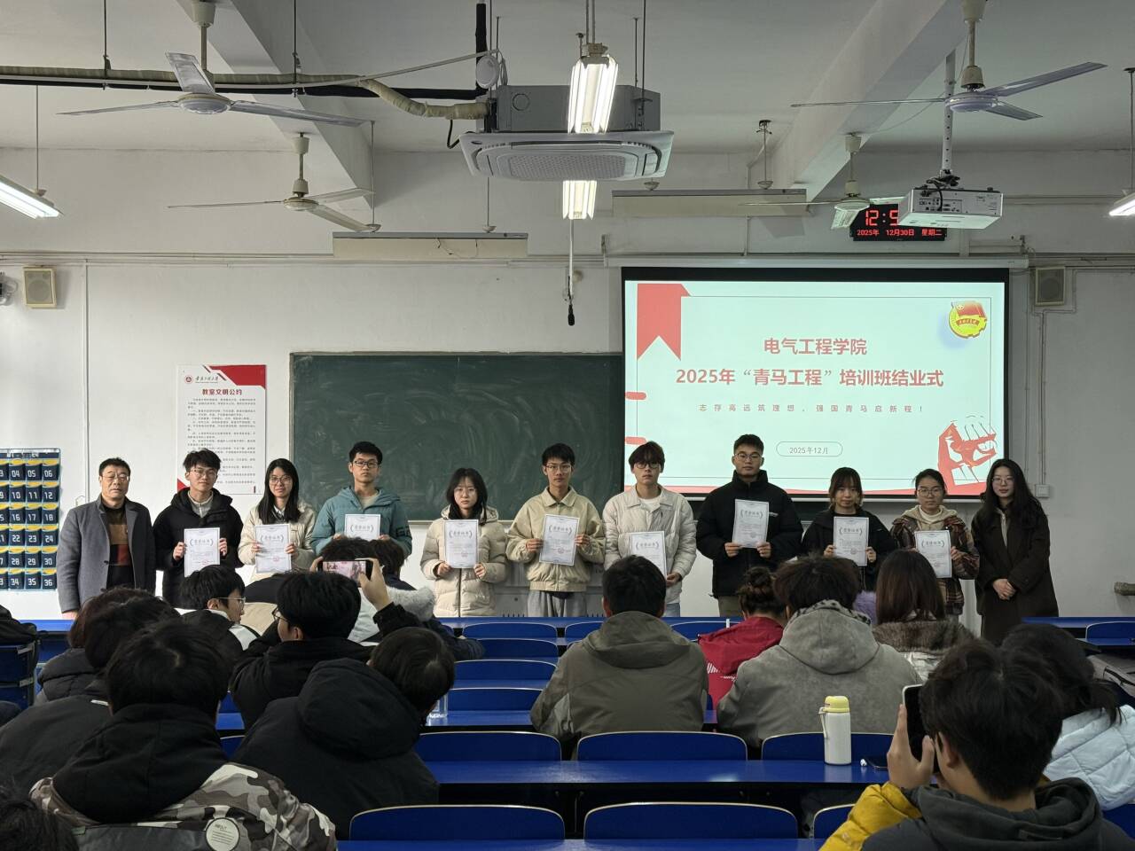 12月30日,电气工程学院“青年马克思主义者培养工程”培训班(以下简称“青马班”)结业仪式在6J110举行。学院党委书记张春出席仪式并讲话,培训班班主任王莹莹及全体学员参会。