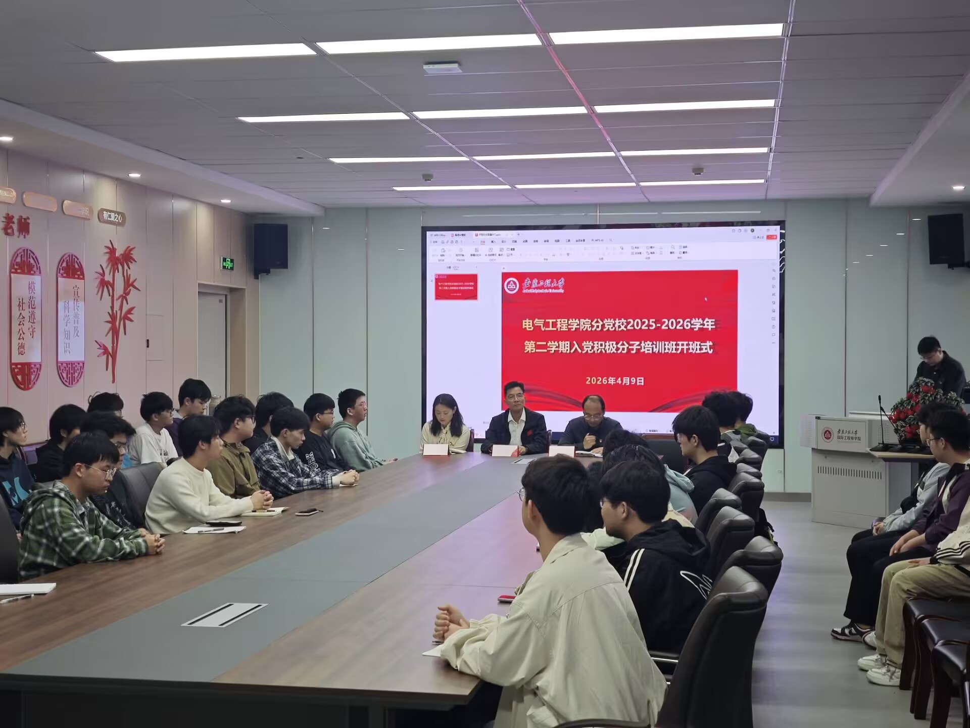 为深入学习贯彻党的二十届四中全会精神,严把党员队伍“入口关”,4月9日,电气工程学院2025-2026学年第二学期入党积极分子开班仪式在206会议室举行。校党校督导组成员、正处级组织员文才新,学院党委副书记迟传德出席仪式。学院组织员、辅导员及本期全体入党积极分子参加活动。仪式由培训班班主任张靖主持。