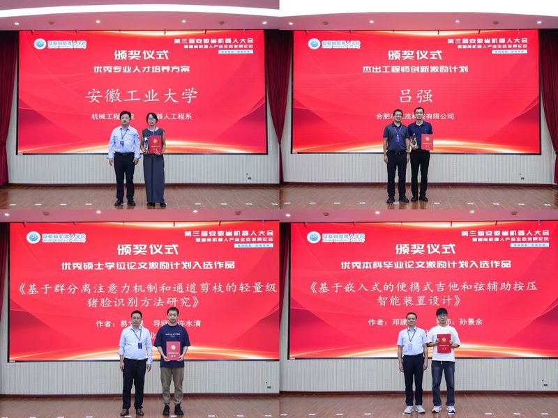 大会同时举行了2025年度安徽省机器人学会颁奖仪式,设置了优秀青年教师科技发展激励计划、优秀青年教师教育发展激励计划、杰出工程师创新激励计划、优秀专业人才培养方案、优秀本科毕业论文激励计划入选作品、优秀硕士学位论文激励计划入选作品等项目,对获奖单位和个人进行了颁奖。